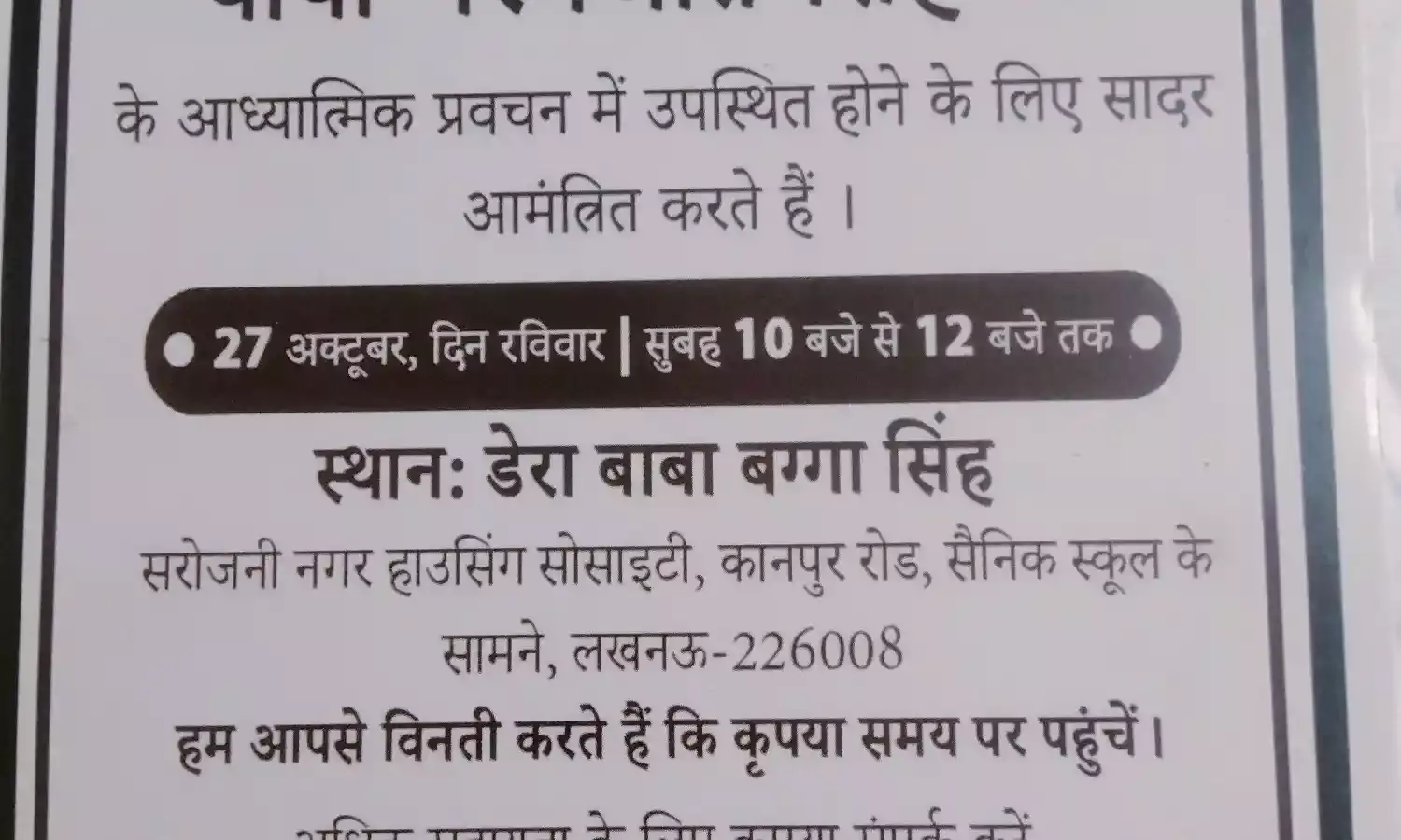 The satsang will take place at Dera Baba Bagga Singh, located in Sarojini Nagar Housing Society, opposite Sainik School on Kanpur Road, Lucknow. The venue is easily accessible by public transport, and parking will be available for those arriving by car. It is recommended that participants arrive early to avoid any delays.